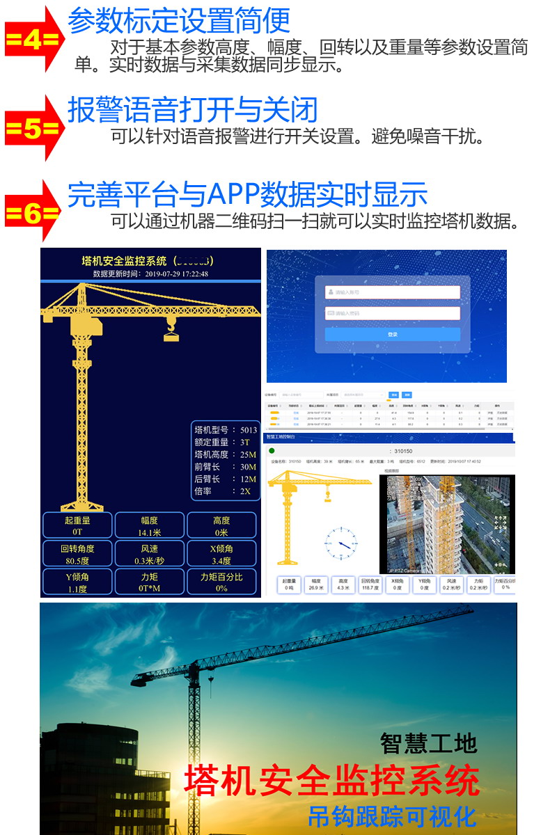 在塔機(jī)安全系統(tǒng)基礎(chǔ)上增加的吊鉤視頻實(shí)時(shí)跟蹤,塔吊吊鉤可視化系統(tǒng)是采用高清球機(jī),采用智能算法進(jìn)行對(duì)施工的塔吊吊鉤實(shí)時(shí)跟蹤,無(wú)需人工參數(shù),根據(jù)吊鉤的運(yùn)行而實(shí)時(shí)調(diào)焦,對(duì)焦,而實(shí)現(xiàn)的吊鉤運(yùn)行的實(shí)時(shí)跟蹤。改系統(tǒng)可以使司機(jī)能夠快速準(zhǔn)確的做出正確的操作和判斷,解決了施工現(xiàn)場(chǎng)塔吊司機(jī)的視覺(jué)死角,遠(yuǎn)距離視覺(jué)模糊,語(yǔ)音引導(dǎo)易出差錯(cuò)等行業(yè)難題。視頻可以實(shí)時(shí)傳輸?shù)骄W(wǎng)絡(luò),可以通過(guò)手機(jī)或者PC進(jìn)行實(shí)時(shí)監(jiān)控設(shè)備運(yùn)行,有效避免事故的發(fā)生,從而提高工地現(xiàn)場(chǎng)施工的效率,減少事故的發(fā)生。