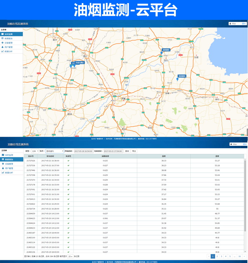 油煙在線監(jiān)控系統(tǒng)由實時數(shù)據(jù)監(jiān)測、歷史數(shù)據(jù)查詢、基礎(chǔ)信息管理等七部分功能組成,支持通過GIS地圖定位展示各餐飲企業(yè)的實時監(jiān)測狀態(tài)。