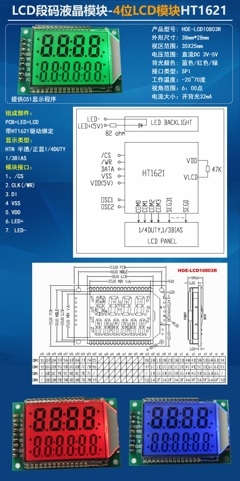 多色雙排LCD段碼液晶顯示模塊HT1621驅(qū)動