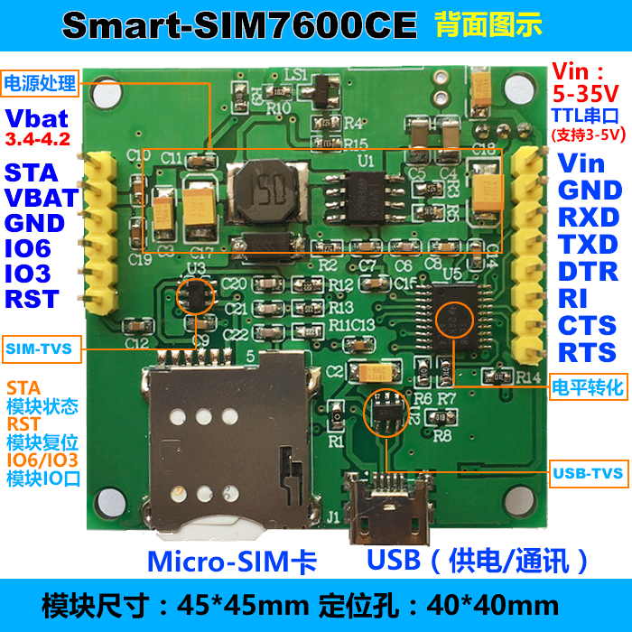 HOE-Smart-SIM7600CE 4G開發(fā)模塊。支持全網(wǎng)通,支持USB通訊供電、外接5V-38V供電,不支持語音功能,采用Mcro-SIM卡自彈卡槽。 可接3.7-4.2V鋰電池;