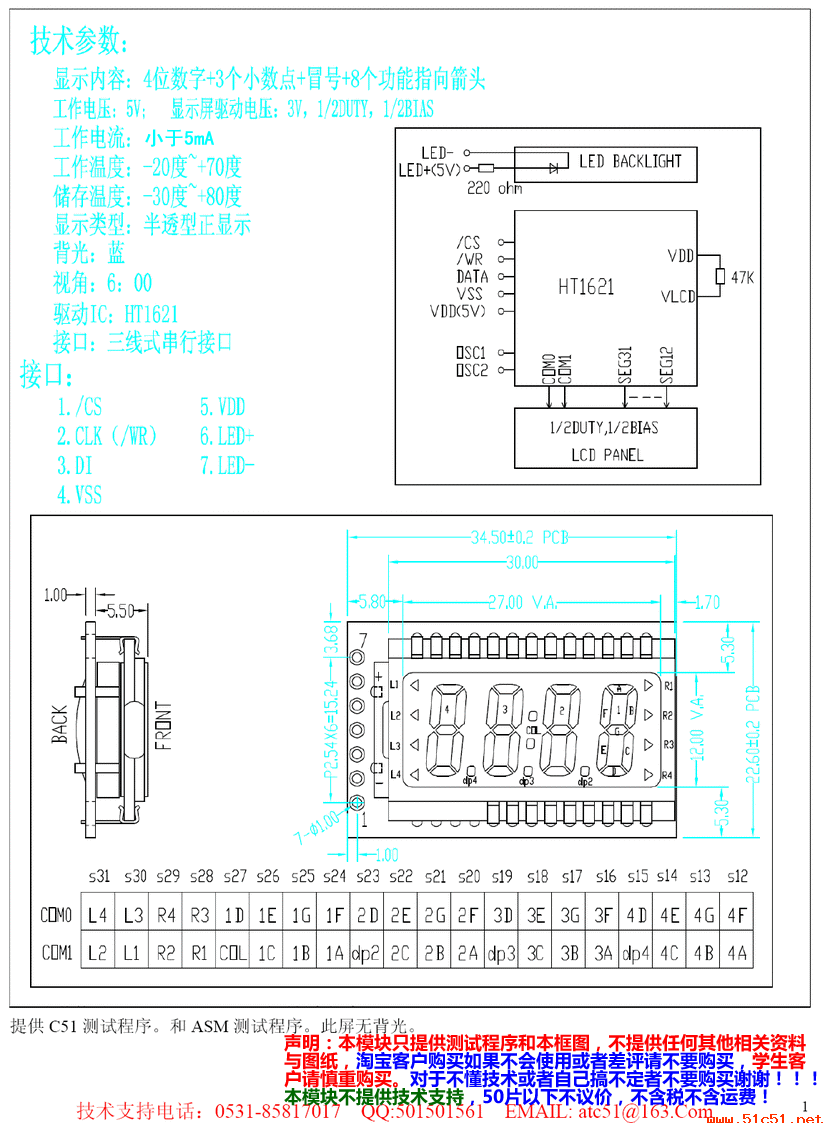 LCD段碼液晶,板載HT1621驅(qū)動芯片,CPU直接驅(qū)動即可!